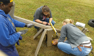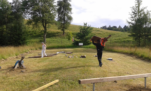 We hadden thuis alles goed voorbereid en materiaal compleet gemaakt, zodat we daar direct aan de slag konden. Na vier dagen waren we al enorm opgeschoten. De dubbele schommel stond, de twee wipkip/traktorren, de evenwichtsbalk, de houten wip en de trampoline, die al werd gebruikt door langskomende kinderen/jeugd en uiteraard onze eigen groep. Het begon voor de mensen daar al echt ergens op te lijken en er werd besloten ’s zondags de speeltuin te openen, omdat de mensen dan wat meer tijd hadden. We moesten flink aan de slag met het klimhuis, waar drie rekstokken een touwladder, glijbaan en schommel aan moesten komen. (slik) Dit heeft de nodige zweetdruppeltjes gekost, want de temperatuur liep ‘s middags op naar 35 graden en we bouwden alles op een glooiend stuk gras. Maar op een haar na was zaterdagavond alles gereed en ook nog gebeitst, zodat het er fris uitzag allemaal.