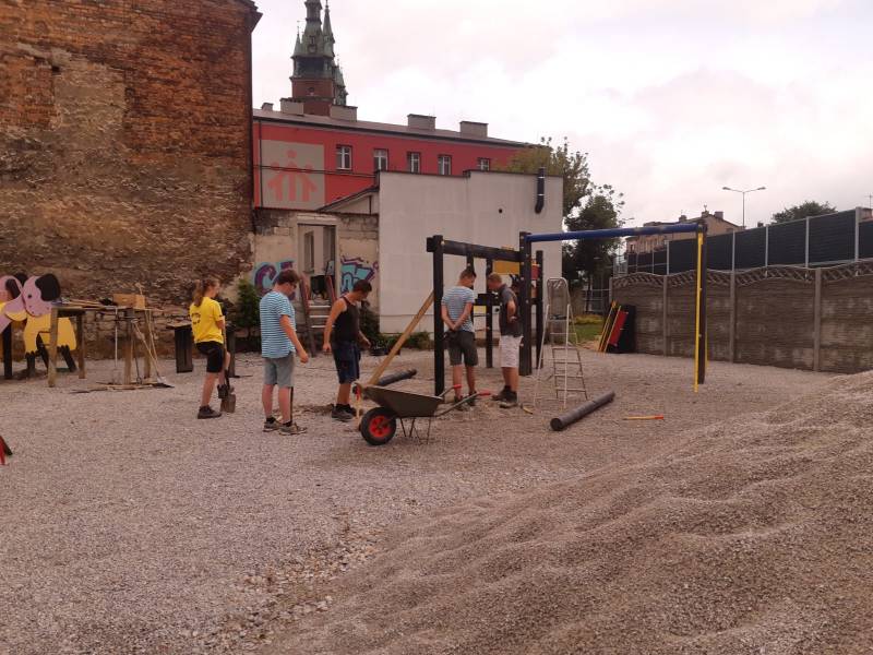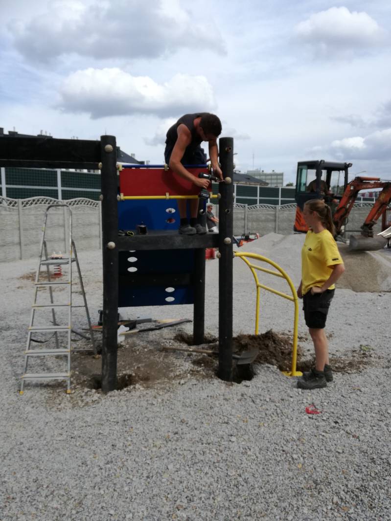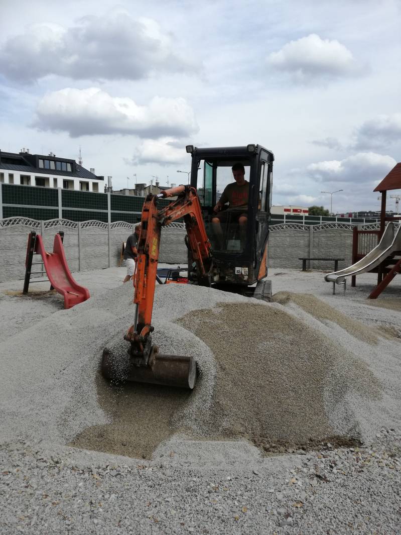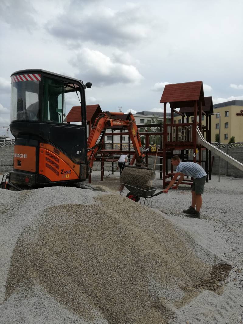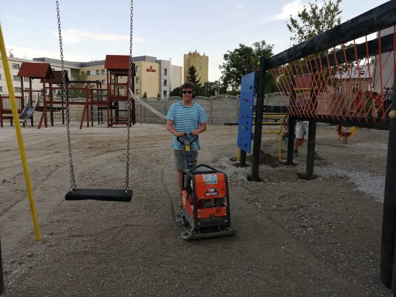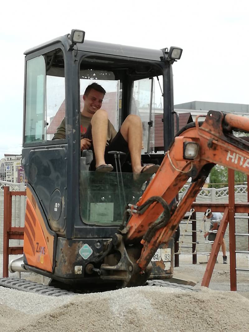 De machinist had de makkelijkste taak, wij liepen als mieren over de speelplek met harken, schoppen, kruiwagens, schoonmaak sponsjes, verfkwasten en ander gereedschap.