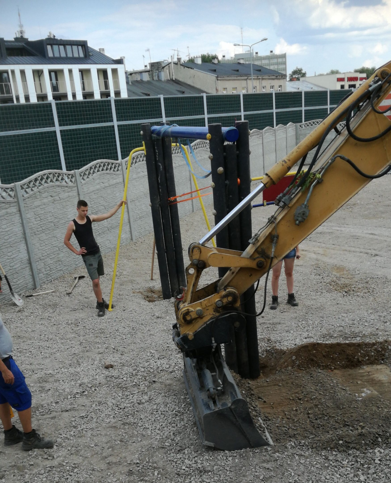 Nu het eerste onderdeel van de speeltuin staat, hebben we de smaak te pakken en met de hulp van de graafmachine valt het graafwerk mee. Daarnaast is er een begin gemaakt met het bouwen van het zwarte klimtoestel.